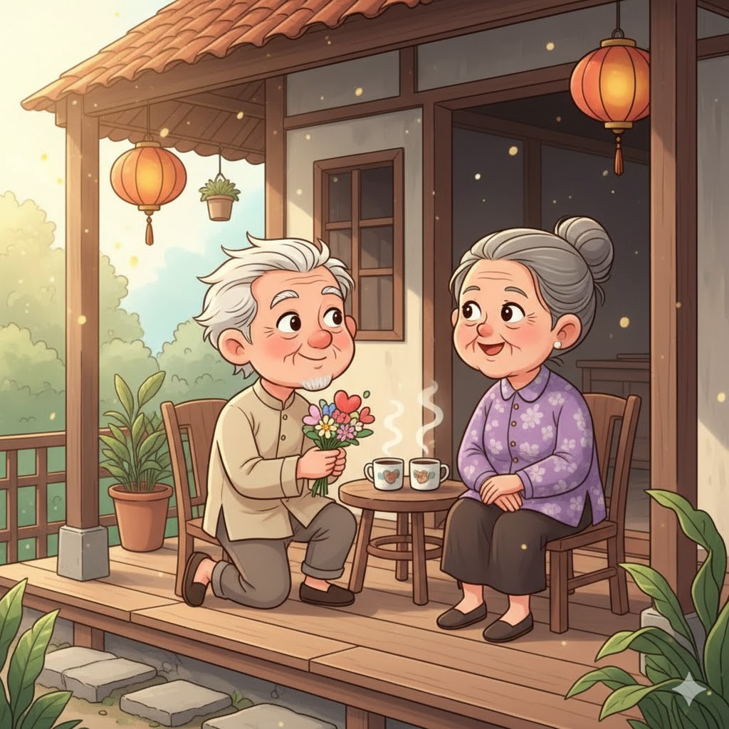 Ông Cường và bà Thủy ở cùng khu phố, đều ngoài bảy mươi, con cái đi xa hết. Sáng nào hai ông bà cũng gặp nhau ở quán cà phê đầu ngõ — ông uống cà phê đen, bà thì ly sữa nóng — rồi nói chuyện trời mây, hoa cỏ, con cháu.