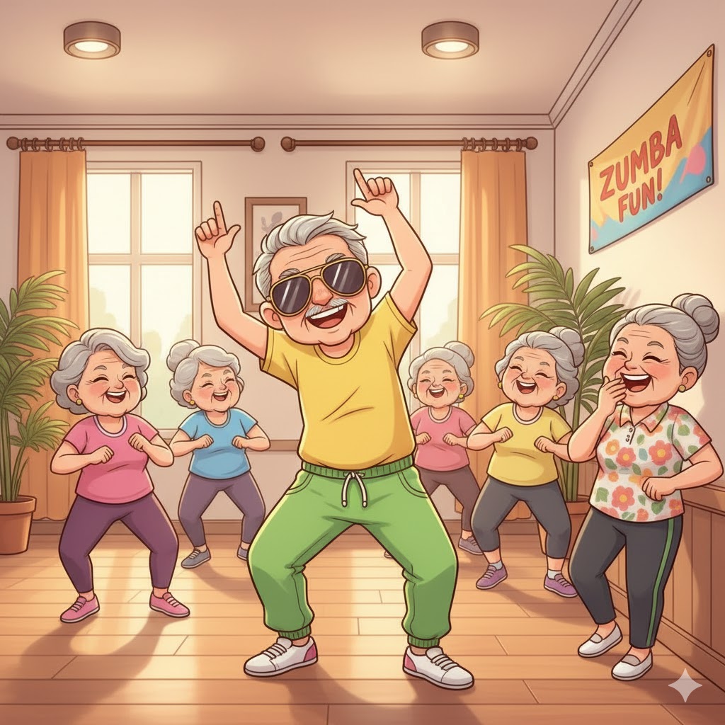 Rồi ông đăng ký luôn lớp Zumba cho người cao tuổi ở nhà văn hóa. Cả lớp toàn các bà ngoài sáu mươi, chỉ có mình ông là nam.