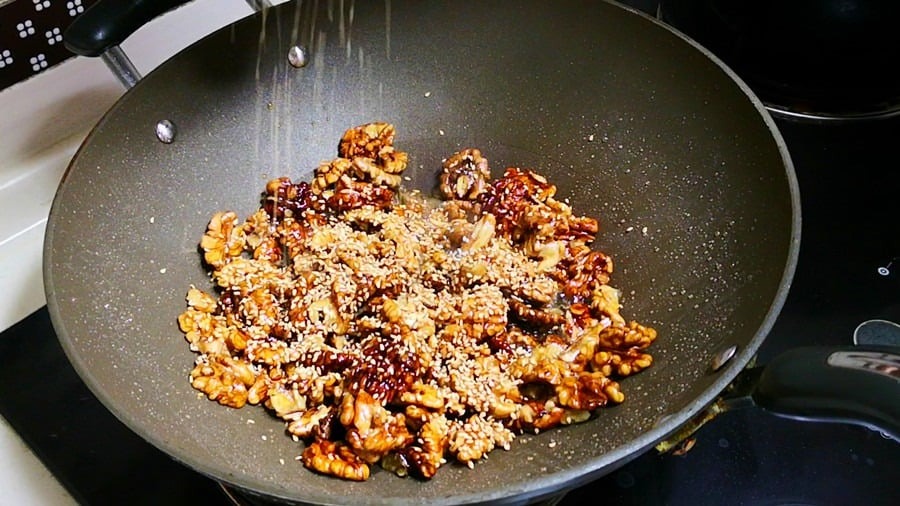 - Sau đó, cho quả óc chó vào siro và xào đều sao cho từng quả óc chó được phủ siro. Cuối cùng, thêm một lượng mật ong vừa đủ và tiếp tục xào cho đến khi siro đặc lại và tạo thành một lớp đường tinh thể phủ trên bề mặt quả óc chó.
