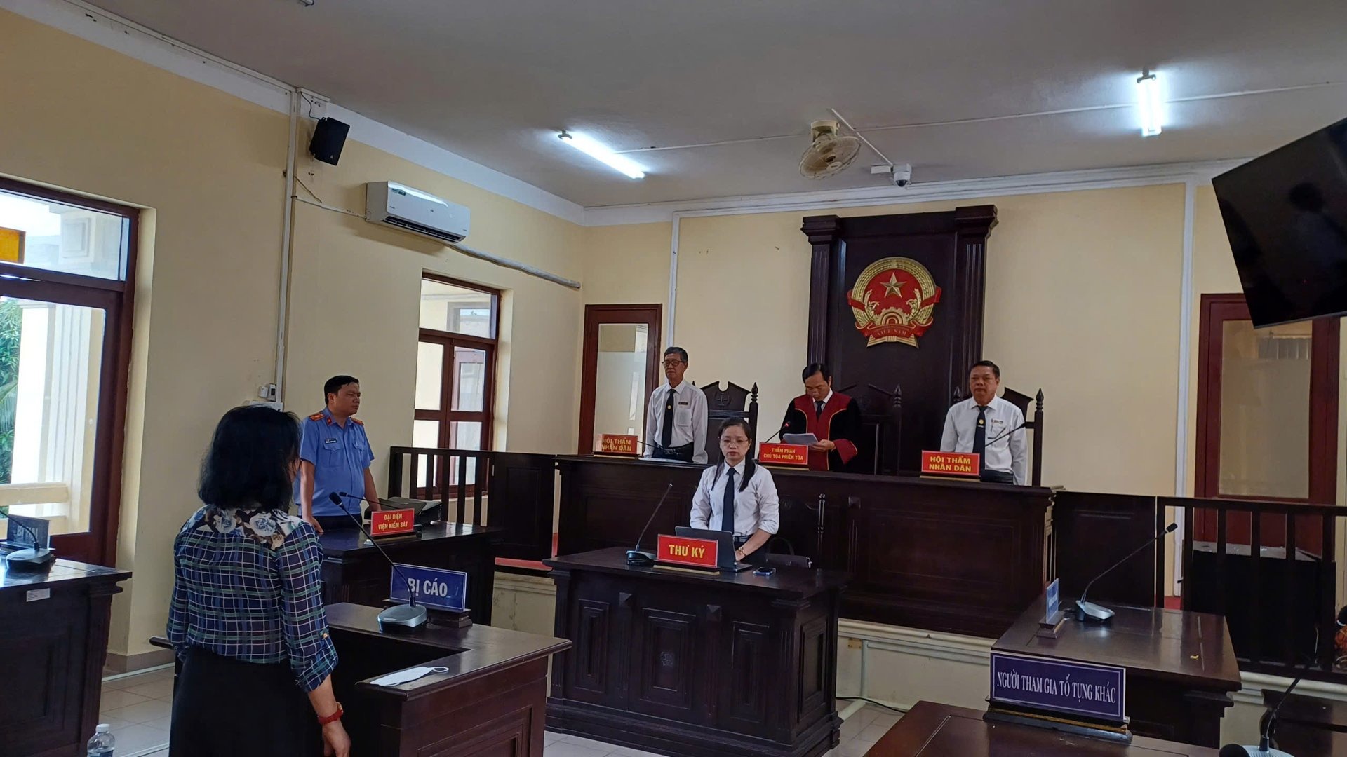 Nữ bị cáo Âu Ngọc Vững ở Cà Mau hầu tòa vì chỉ đạo cưa cây, và đập phá lối đi. Ảnh: An An