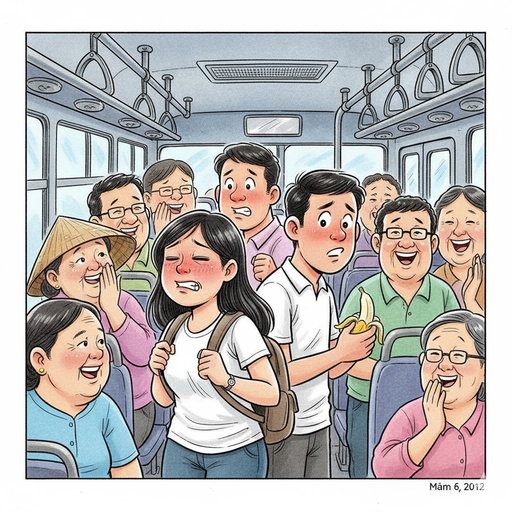 Trên chiếc xe buýt đông nghẹt người, cô sinh viên cẩn thận giữ khư khư quả chuối trong túi quần sau, sợ chen lấn làm bẹp mất “bữa sáng” của mình.