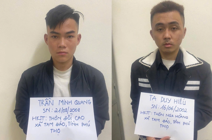 Ngày 16/11, Cơ quan Cảnh sát điều tra Công an tỉnh Phú Thọ cho biết đang củng cố hồ sơ để xử lý Trần Minh Quang, 17 tuổi và Tạ Duy Hiếu, 23 tuổi, cùng trú xã Tam Đảo, về hành vi Cướp tài sản.