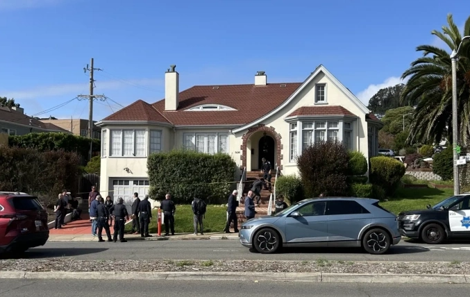 Cảnh sát điều tra làm nhiệm vụ trước căn nhà của vợ chồng Ocheltree và Truong ở San Francisco. Ảnh: KRON 4