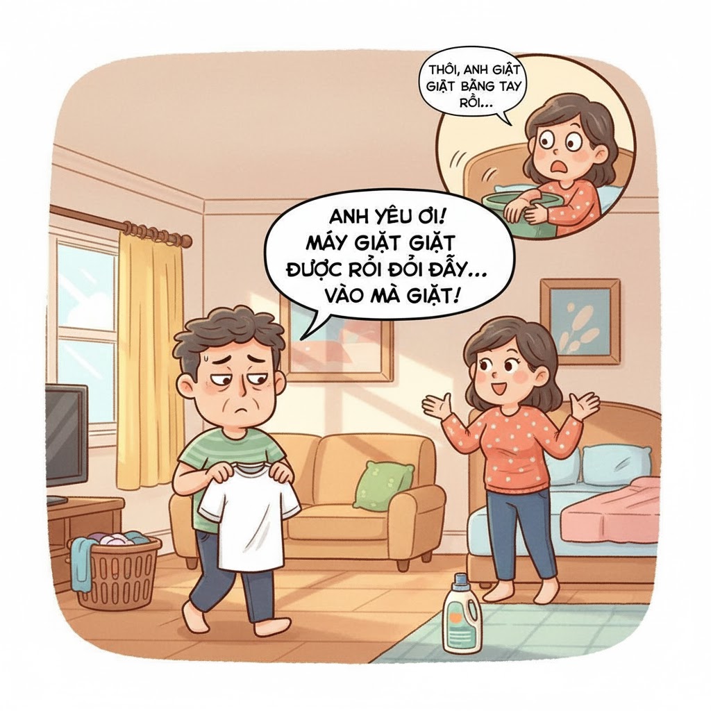– Anh yêu ơi! Máy giặt giặt được rồi đấy… vào mà giặt!