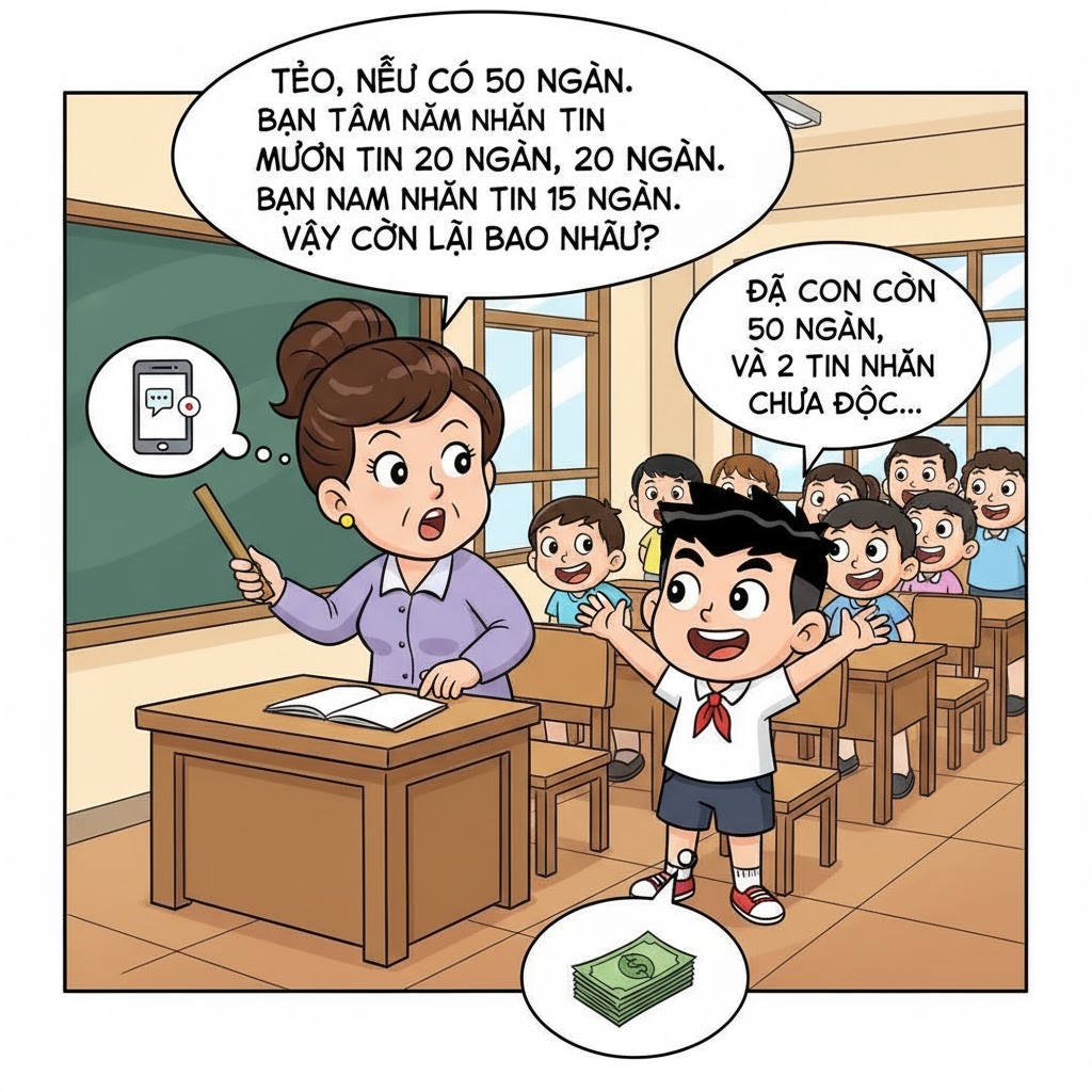 Cô giáo: "Nào, Tèo! Em nghe kỹ câu hỏi nhé. Giả sử em có 50 ngàn đồng tiền lì xì. Hôm đó, bạn Tâm nhắn tin Zalo cho em, nói: 'Tèo ơi, cho Tâm mượn 20 ngàn mua truyện tranh nha!'."