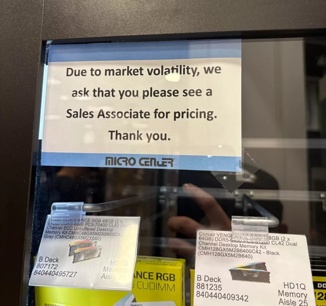 Micro Center cũng đã cho ngừng hiển thị ra giá bán bộ nhớ. Người dùng Reddit CassTexas đã đăng một bức ảnh về nhãn cảnh giác của cửa hàng, trong đó khuyến cáo khách hàng nên gặp trực tiếp nhân viên bán hàng để biết thông tin về giá cả.