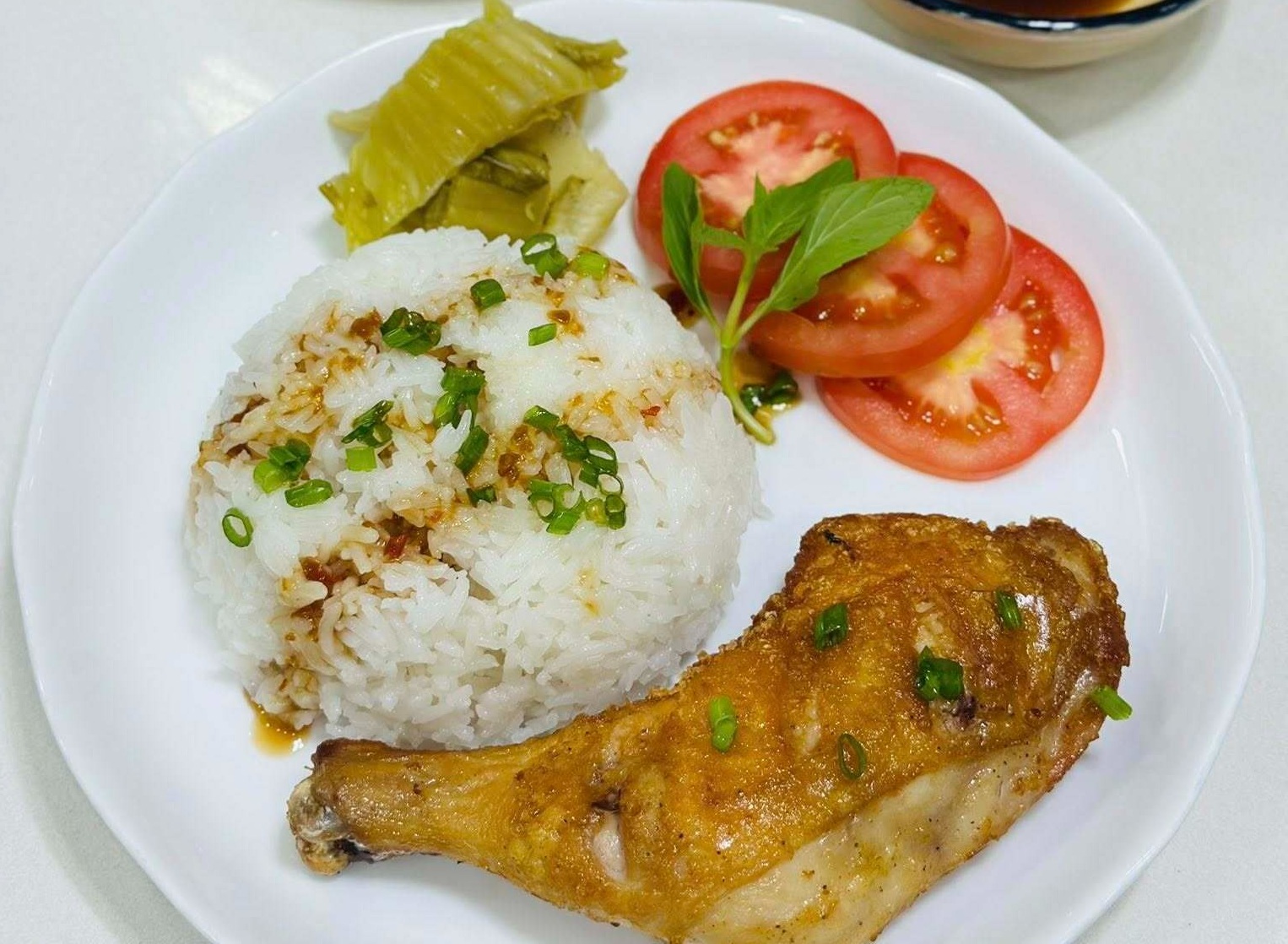 Thưởng thức: cơm trắng nóng hổi, gà chiên giòn rụm, vài lát cà chua đỏ mọng thêm miếng dưa cải chua cân bằng vị, chan nhẹ mỡ hành lá phi thơm lừng và cuối cùng là nước sốt rưới lên cơm gà – đậm đà, cuốn cực kỳ.