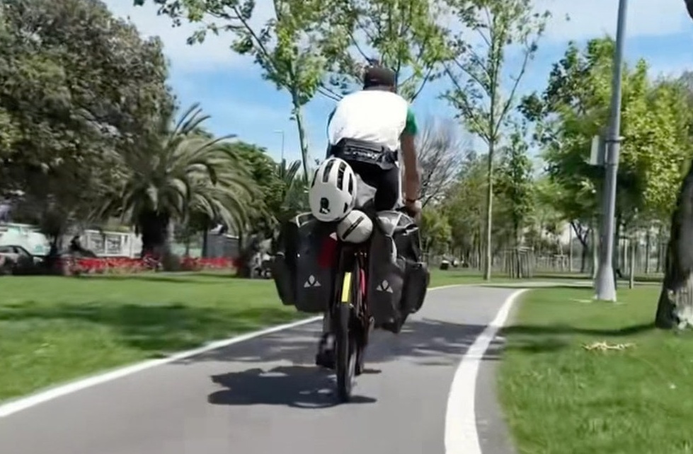 Killian Le Guyader đạp chiếc xe đạp chở đầy hành lý của mình. Anh đã đi qua hơn 30 quốc gia để tới Trung Quốc. Ảnh: Douyin