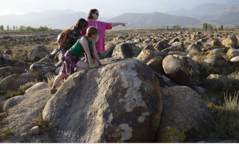Một số nhà nghiên cứu của đoàn thám hiểm bên cạnh Hồ Issyk-Kul, trên dăy núi Thiên Sơn gần biên giới Kyrgyzstan với Kazakhstan.