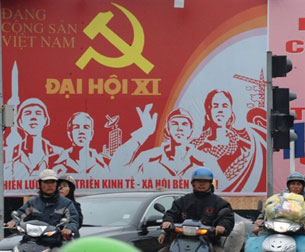 Biểu ngữ chào mừng Đại hội ĐCS VN lần thứ 11 treo dọc đường phố trung tâm thành phố Hà Nội hôm 11 tháng 1 năm 2011.