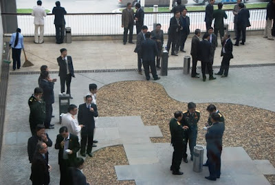 Hiếm khi báo chí quấy phiền các đại biểu trong giờ giải lao. Ảnh: Xuân Ba. Theo thông lệ, h́nh như ĐH Đảng cũng theo lịch Quốc hội, phiên sáng th́ 9 giờ 30, phiên chiều th́ 15 giờ 30 ( nếu không có ǵ đột xuất hoặc bất thường) th́ các ĐB nghỉ giải lao 20 phút. Các kư giả được cấp