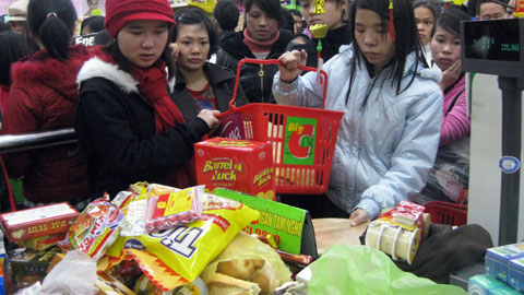 Cuối năm, siêu thị, cửa hàng đua nhau khuyến măi, giảm giá, người dân v́ thế cũng có cơ hội sắm Tết nhanh hơn, thuận lợi hơn. Cận Tết, người người, nhà nhà rủ nhau “siêu thị tiến”. Ṿng qua các siêu thị lớn ở Hà Nội như Big C, Metro, Co.op Mark, đâu đâu cũng thấy người chen chân mua sắm.