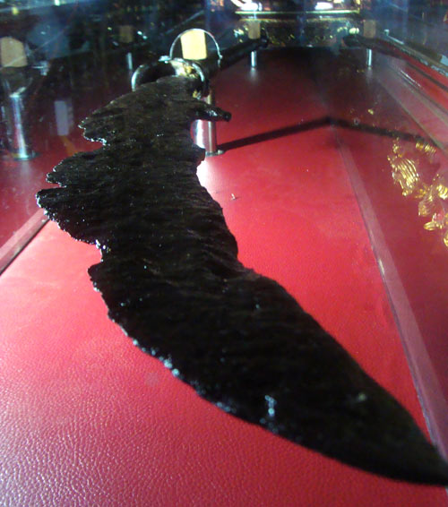 Qua ánh nến leo lét, có thể nhận thấy sự hoành tráng của đại long đao, thậm chí, có phần nhỉnh hơn đại long đao mà Quan Vân Trường tung hoành giữa vạn quân như chốn không người. Chỉ tiếc rằng, đại long đao được đúc bằng sắt, nên độ bền kém, bị thời gian gặm nhấm phần nào. Phần cán đao đă đổ màu đen gỉ. Lưỡi đao cũng màu xỉn và vỡ nham nhở. Tuy nhiên, nếu xét về độ tuổi và nguồn gốc của đại long đao, có thể thấy sự vô giá của nó.
