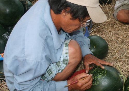 Vuông vức trên một diện tích khoảng 16m2, hàng trăm trái dưa hấu chất đống cao nghệu. Đặc biệt trên những trái dưa này có hình long phụng, có những câu chúc tụng đẹp mắt. Nét vẽ điệu luyện, nét bút sắc sảo. Hình và chữ giao nhau trên một trái dưa kích thích tính hiếu ký của nhiều người.