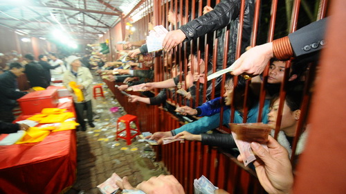| Hàng vạn người bao vây, chen chúc xung quanh nơi bán  ấn. Năm nay, ban tổ chức cho gần 70 điểm bán ấn nhưng vẫn không đáp ứng  nổi - Ảnh Thuận Thắng