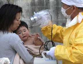 Một bé trai 1 tuổi đang được khám nghiệm xem có bị nhiễm phóng xạ tại khu vực Nihonmatsu, Fukushima, miền bắc Nhật Bản, ngày 14-3-2011 – ảnh: Toru Nakata/Asahi Shimbun.
