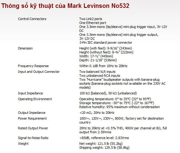 Mark Levinson No532 là ampli công suất 2 kênh với hai cục ampli mono độc lập cho công suất 400W mỗi kênh (8 ohm) hoặc 800W mỗi kênh (4 ohm).