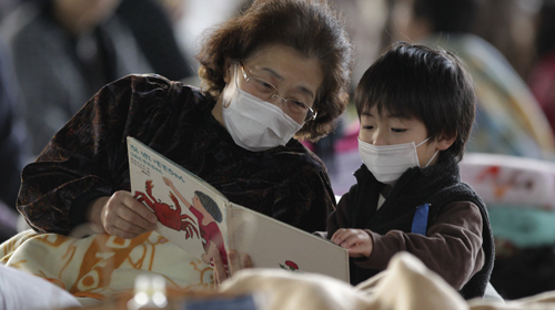 | Chú bé này đang tập đọc cùng bà tại khu trung tâm thể thao thị trấn Yamagata, đông bắc Nhật Bản, trong những ngày lánh nạn động đất - sóng thần - Ảnh: Reuters |