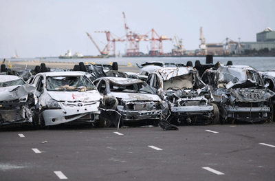 Xe hơi mới ở băi đậu xe Toyota tại Sendai bị sóng thần phá hỏng. Thiên tai làm gián đoạn hệ thống cung cấp phụ tùng, làm rối loạn kỹ nghệ xe hơi toàn thế giới. (H́nh: AP Photo/Wally Santana)
