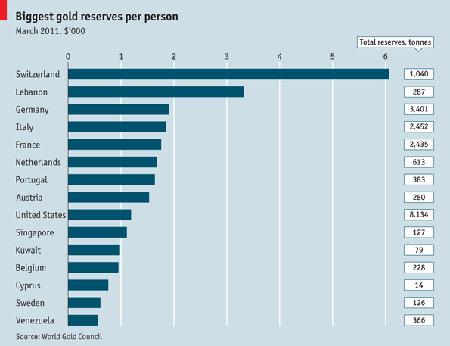 Nước có tỉ lệ dự trữ vàng trên dân số lớn nhất?