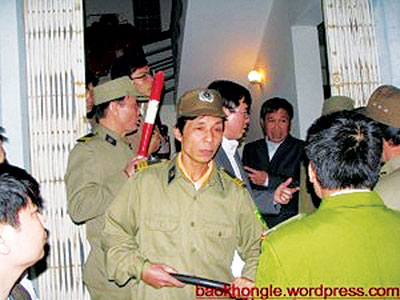 Luật Sư Lê Quốc Quân, người tự ứng cử đại biểu Quốc Hội ở Hà Nội bị đám  “bảo vệ” chận ngay ở cửa không cho vào địa điểm tổ chức “hiệp thương”.  (H́nh: Báo Không Lề)