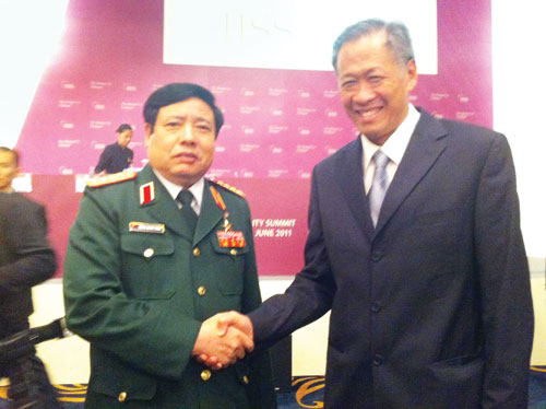 Bộ trưởng Quốc pḥng Singapore Ng Eng Hen chúc mừng sau bài  phát biểu và trả lời của đại tướng Phùng Quang Thanh - Ảnh: Thục Minh |