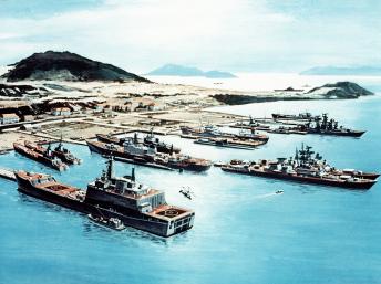 Ảnh vẽ chiến hạm Liên Xô tại căn cứ Cam Ranh (vào năm 1985) trong kho tư liệu ảnh của Lầu Năm Góc (Nguồn : Bộ Quốc phòng Hoa Kỳ)