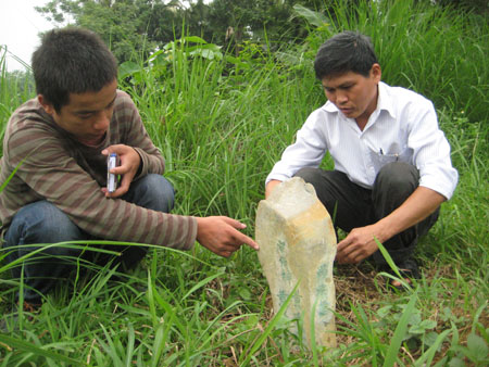 Gia đ́nh ông Dũng vô t́nh phát hiện tấm bia này khi làm cỏ mộ.