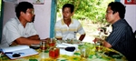 Đại diện Báo Đại đoàn kết trao đổi với các nhân chứng của trận hải chiến Hoàng Sa năm 1974 - Ông Nguyễn Văn Chọn, thủy thủ tuần dương hạm HQ-6 (trái); Ông Tư Hà, thủy thủ tuần dương hạm Nhật Tảo - HQ-10 (giữa)