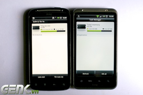 RAM của Sensation bao giờ cũng ít hơn Desire HD khoảng 80-100 MB. Có vẻ như 768 MB RAM là chưa đủ vì Sense 3.0 hơi nặng.