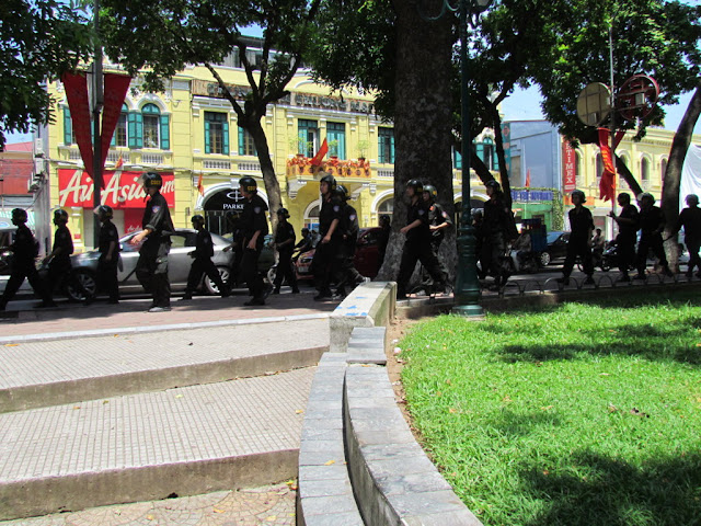 Anh em CSCĐ cũng vất vả không kém, không kể số mặc thường phục đi lẫn trong đoàn, lực lượng công khai phải ứng trực ở Vườn hoa Tượng đài Lê Nin từ sáng sớm, ngăn đường, bê bảng, cột dây cách ly "Cấm tụ tập đông người", "Cấm quay phim chụp ảnh"... đến tận chiều tối. Số đông khác (cả Đại đội) ứng trực ở đơn vị với đủ lệ bộ (mũ bảo hiểm nặng trịch, quần áo "bắt gà" thùng thình, ghệt cao cổ bó chít ống chân, dùi cui...), có lệnh phát là lao vù lên xe thùng, phi ra địa điểm làm nhiệm vụ giải tán đám đông, cô lập - phân tán...