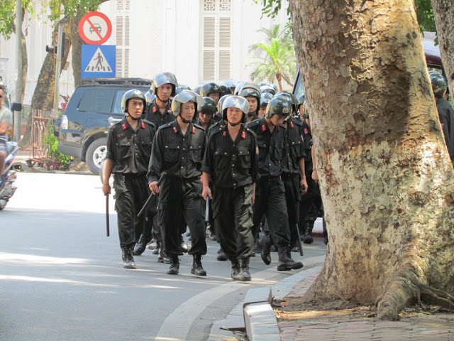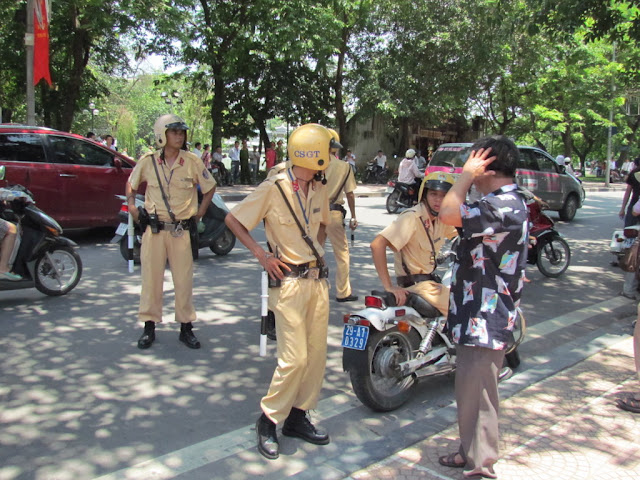 Đi cùng với đoàn từ Điện Biên Phủ lên Hồ Hoàn Kiếm, nhìn anh em CSGT ướt đẫm mồ hôi lưng áo, mặt bạc phếch, thở không ra hơi, khát cũng không dám rẽ ngang vào hàng mua chai nước uống (như mình), mệt cũng không được chọn bóng cây, ngồi bệt vỉa hè hút thuốc... giải lao (như mình), mà thương quá.