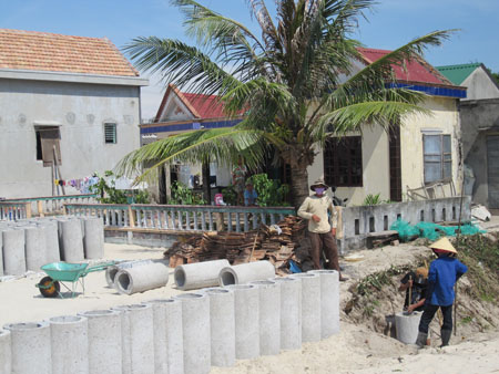 | Người dân Tân Hải dùng ống bi xây kè chống cát.