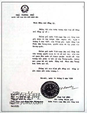 Các đảo ở Nam Hải (tức Biển Đông – ND) bao gồm quần đảo Nam Sa (tức Trường Sa – ND) và quần đảo Tây Sa (tức Hoàng Sa – ND) về lịch sử chính là lănh thổ của TQ, TQ không chỉ có chứng cứ đầy đủ về lịch sử và pháp lí, mà cả cộng đồng quốc tế trong đó bao gồm cả VN cũng đă thừa nhận chủ quyền của TQ. Ngày 15 tháng 6 năm 1956, khi Thứ trưởng Bộ ngoại giao VN Ung Văn Khiêm tiếp kiến Đại biện lâm thời Lănh sự quán TQ trú tại VN đă bày tỏ, theo các tư liệu về VN, xét về mặt lịch sử, các quần đảo Tây Sa (tức Hoàng Sa – ND), Nam Sa (tức Trường Sa – ND) nên thuộc về lănh thổ TQ. Khi ấy, Quyền Vụ trưởng Vụ Châu Á Bộ ngoại giao VN Lê Lộc có mặt tại đó nói, xét về mặt lịch sử, các quần đảo Tây Sa (tức Hoàng Sa – ND), Nam Sa (tức Trường Sa – ND) đă thuộc TQ ngay từ đời Tống. Ngày 4 tháng 9 năm 1958, chính phủ TQ ra tuyên bố chiều rộng lănh hải là 12 hải lí, báo “Nhân dân” của VN đă đăng chi tiết lời tuyên bố này vào ngày 6 tháng 9. Ngày 14 tháng 9, Thủ tướng VN Phạm Văn Đồng đă bày tỏ với Thủ tướng Chu Ân Lai là thừa nhận và nhất trí với lời tuyên bố này.