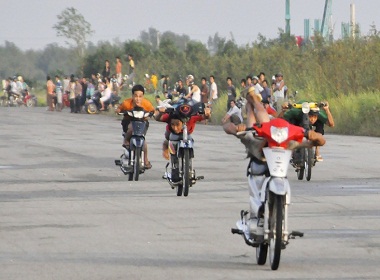 Tốc độ của đoàn xe nhanh chóng được đẩy lên trong tiếng gầm rú ghê rợn của những chiếc pô xe nhả đầy khói trắng. Như để thể hiện kỹ thuật chạy xe cũng như cho thiên hạ thấy con xe “thần tốc” của mình, nhiều thanh niên chạy lướt tới rồ ga, nằm trên yên xe, buông cả hai tay, thậm chí nằm dài trên xe giãy đành đạch như con cá mắc cạn (dân đua xe gọi động tác này là “nằm xòe”).
