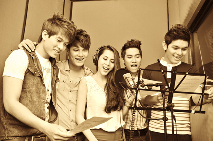 Thủy Tiên xinh đẹp trong pḥng thu cùng nhóm V.Music