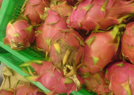 Thanh long ruột đỏ được bán với giá gần 24 ngh́n đồng/kg nhưng nhiều  khách định mua lại quay đi v́ một vài quả thối, sâu được bày lẫn lộn  ngay trên sạp, nh́n không c̣n tươi ngon.