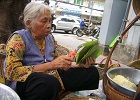 Nhà cụ tại địa chỉ 18/150 đường Trần Quang Diệu, phường 14, quận 3, dù 1 giờ sáng, cụ vẫn cần mẫn làm nếp, trộn đậu, đốt lò nấu xôi. 4 giờ sáng, cụ đã chuẩn bị đi bán. Theo năm tháng, lưng cụ ngày một còng đi. Con cháu ai cũng bận rộn công việc nên cụ thuê một người đạp xích lô, ngày hai chuyến chở cụ đi và về. “Giờ già yếu rồi nên chỉ bán ngày 5 - 7 kg cho vui thế thôi. Bán thế này cũng tùy vào người mua, nếu là người khá giả thì mua bao nhiêu bà bán bấy nhiêu nhưng gặp những người khó khăn thì vừa bán vừa biếu”.