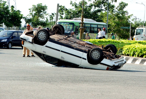 Xế hộp lật ngửa ở vòng xoay, một nhà sư gặp nạn