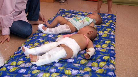 Khi chúng tôi đến là lúc gia đình vừa mới đi bệnh viện tháo băng bó bột cho 2 con cách đó không lâu. Nhìn hai đứa trẻ giống nhau như 2 giọt nước tập bò trên chiếc giường. Nhưng mọi cử động của hai con đều được bố mẹ canh chừng từng ly từng tý một.