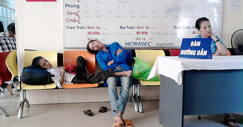 | | Từ 10h đêm ngày 1/8, chị Nguyễn Thị Sáu cùng con trai Nguyễn Bá Tân bắt xe khách từ Nam Đàn, Nghệ An ra Hà Nội. Đặt chân xuống bến xe là 6h sáng. Sau đó 2 mẹ con bắt xe ôm đến thẳng Bệnh viện Nhi TW và dài cổ ngồi chờ. Đến 10h trưa, chị Sáu vẫn tiếp tục chờ vì chưa đến lượt. Quá mệt mỏi, 2 mẹ con chị ngủ ngon lành trên ghế! |