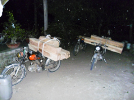 Đúng như lời chị chủ quán nói, trên cung đường tối mịt mùng và im ắng đến rợn người, âm thanh của pô xe rền vang mỗi lúc một lớn dần, ánh đèn pha loang loáng. Lâm tặc đến gần, trên mỗi xe máy chở ba, bốn lóng gỗ dài chạy vụt qua. Chúng tôi lập tức bám theo, anh đồng nghiệp vội rút máy ảnh ra chụp.