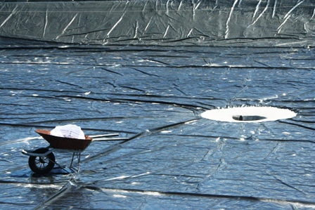 Một xe cút kít nằm chơ vơ giữa hồ tôm