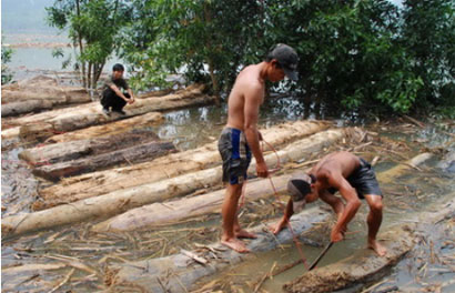 Bạt ngàn gỗ có dấu cắt gọt cẩn thận từ thượng nguồn trôi về ḷng hồ thủy điện A Vương. Ảnh: Đ.Nam (Tuổi trẻ)