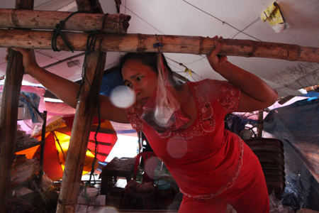 Một người phụ nữ ở P. Vạn Xuân (Đồ Sơn, Hải Phòng) đang cố gắng chống chiếc lều sắp sập vì gió bão. Ảnh: Dân Việt