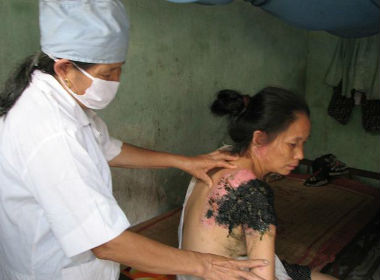 Một bệnh nhân bị bỏng nặng toàn thân đang được Lương y Triệu Thị Liên chữa trị.