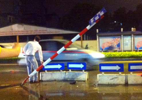 - Đặt câu hỏi thế này th́ khó cho tôi quá. Luật có quy định cắm cột ở giữa đường không? Nếu cắm một cái cột ở giữa đường th́ không có. Nhưng đó là dải phân cách cứng và tôi cắm biển đúng vào dải phân cách chứ không cắm giữa đường.