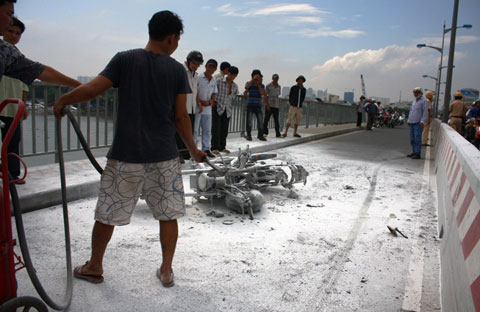 Đang chạy, xe máy bỗng bốc cháy dữ dội trên cầu