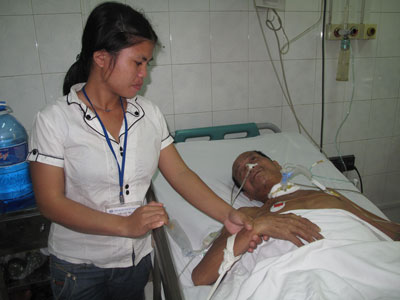 “Cách đây hai tuần, nhân viên y tế bỗng không thấy con cái ông Quyết đâu, gọi theo số điện thoại trong bệnh án th́ biết là con trai, con dâu đang về quê cố xoay tiền chăm lo cho bố nhưng chưa xoay được nên cả hai vẫn c̣n ở quê. Khi họ ra đây vẫn không có tiền, trong khi căn bệnh của ông Quyết đang tiến triển, nếu dừng thuốc sẽ nguy kịch ngay nên bệnh viện quyết định vẫn tiếp tục điều trị cho bệnh nhân”, BS Cấp nói.