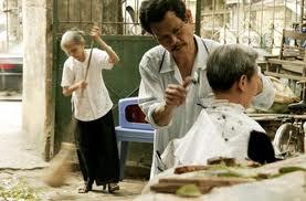 Ông già chống gậy không chỉ cắt tóc, cạo râu mà còn ngoáy tai. Ông nằm ngửa trên ghế lim dim cho ông thợ dùng bông và móc khéo léo ráy cả hai bên tai. Cái cảm giác đầy khoan khoái đó chỉ phải trả thêm năm ngàn đồng.